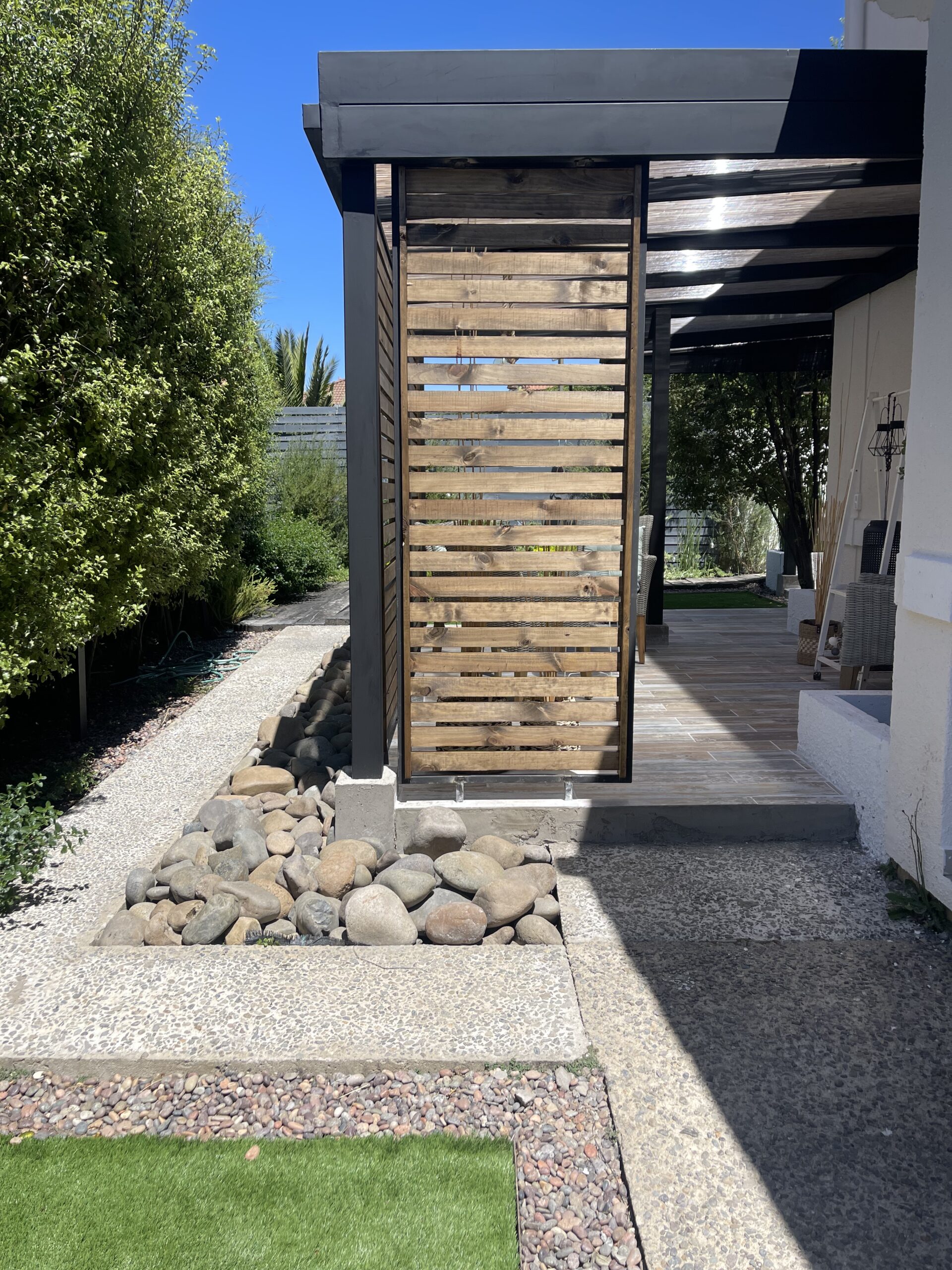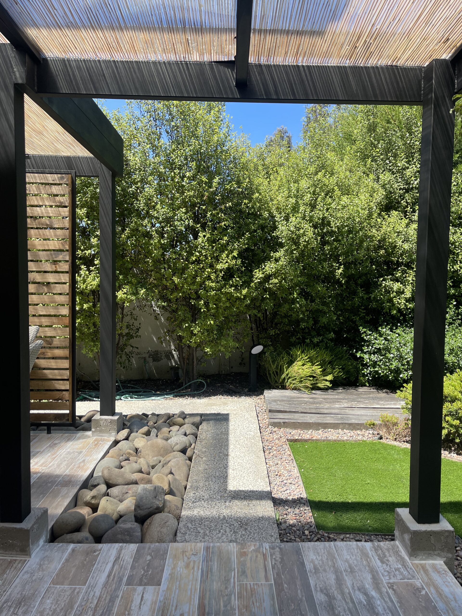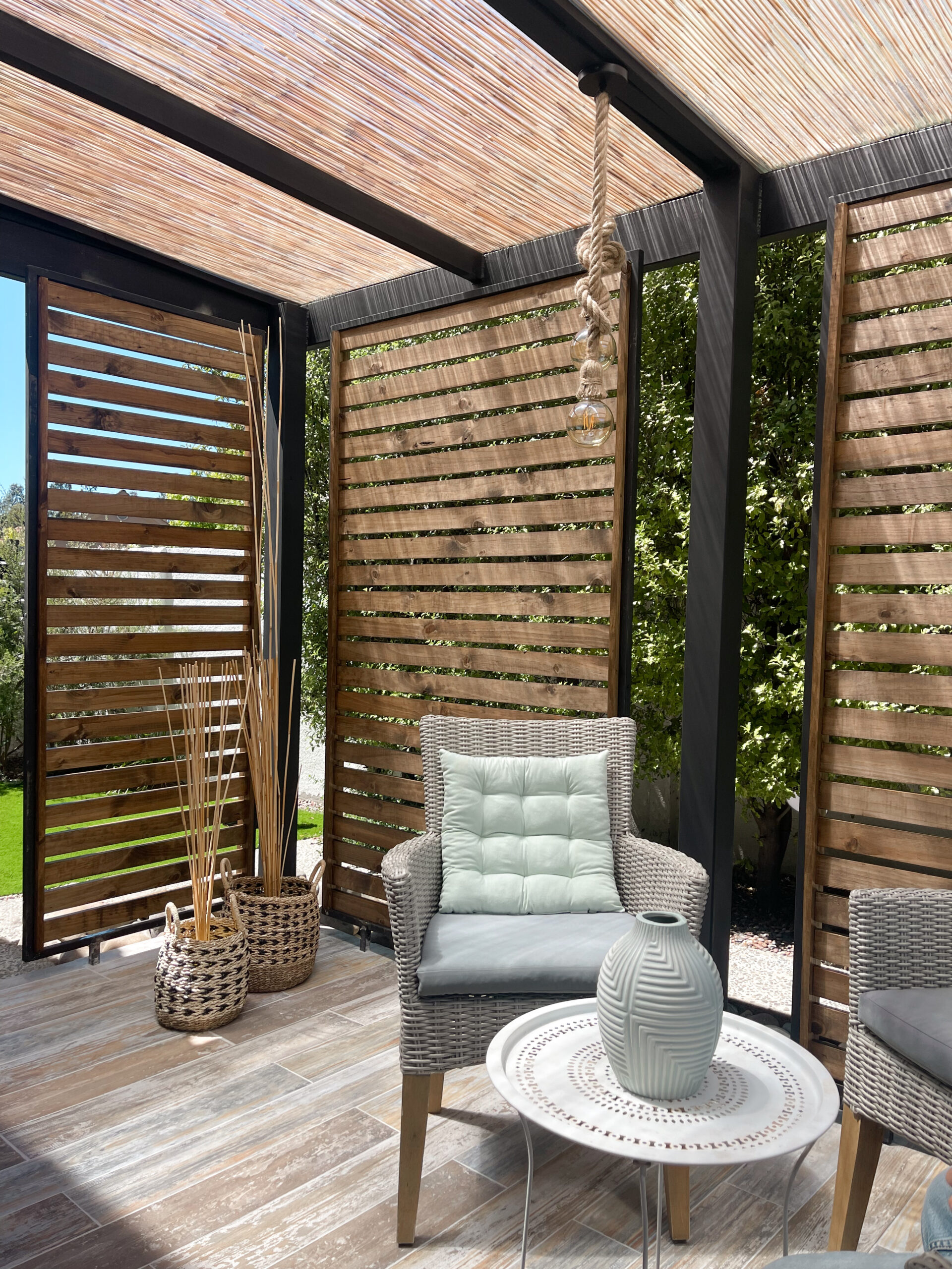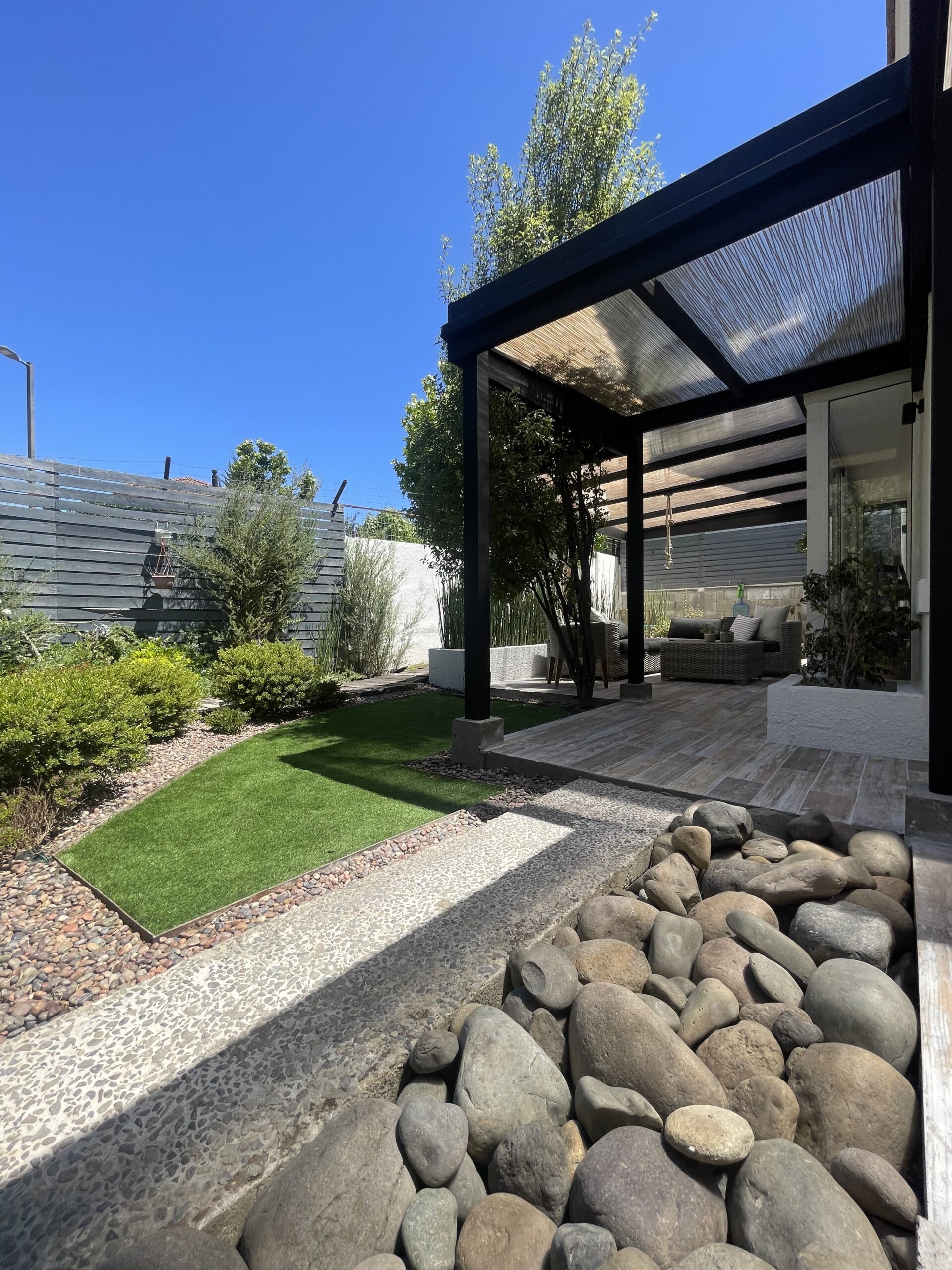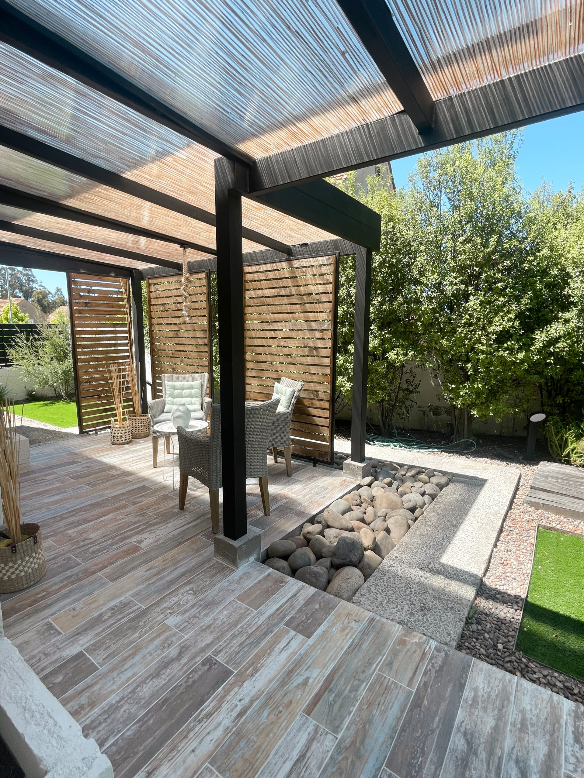 Buscamos crear un espacio versátil y cálido, ideal para reuniones, descanso o conexión con el entorno. Incorporamos madera natural, estructura de acero y un diseño abierto que se adapta tanto al sol como a la sombra. La terraza se integra de manera fluida con la arquitectura existente y aporta valor funcional y estético al hogar.