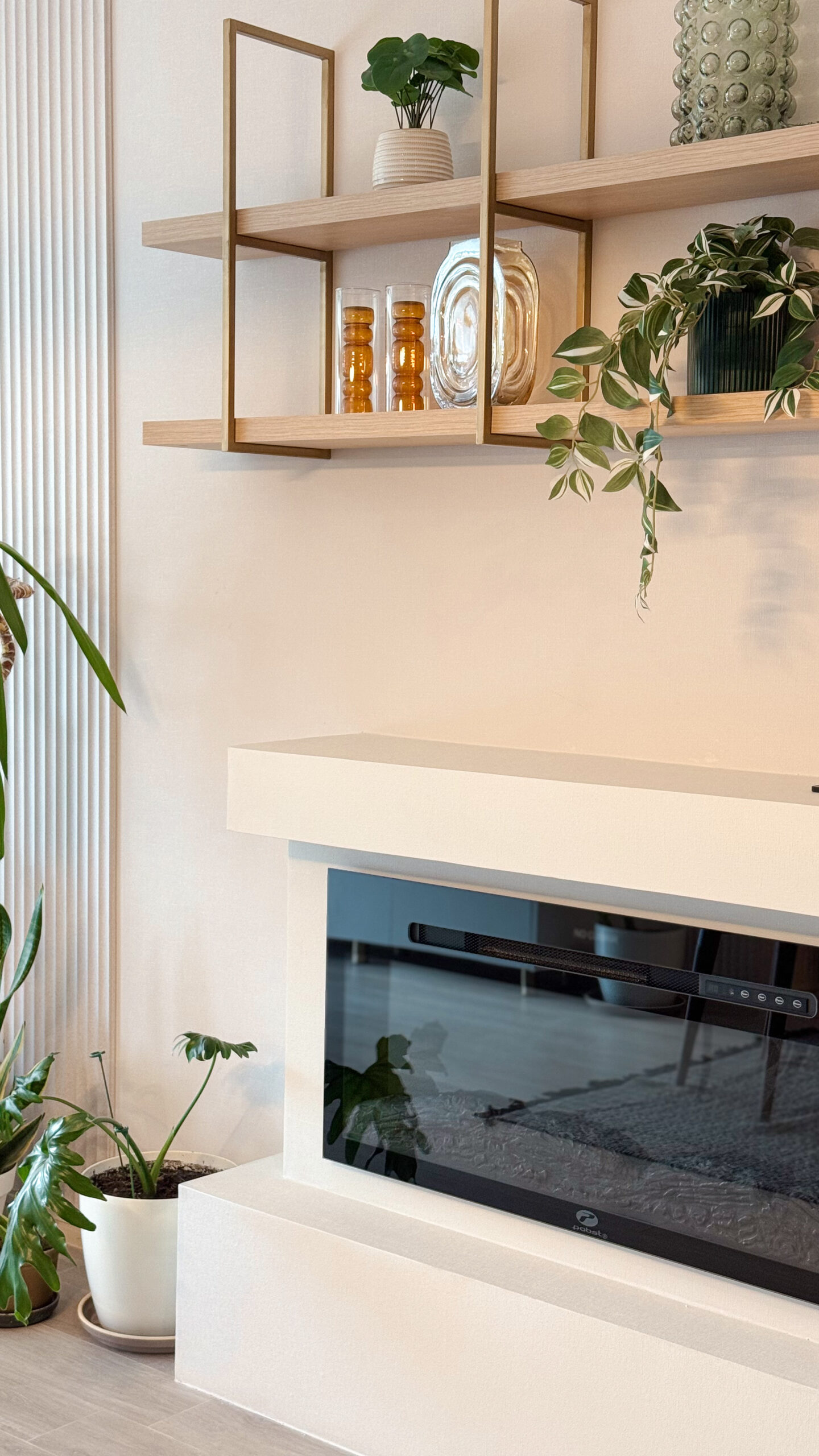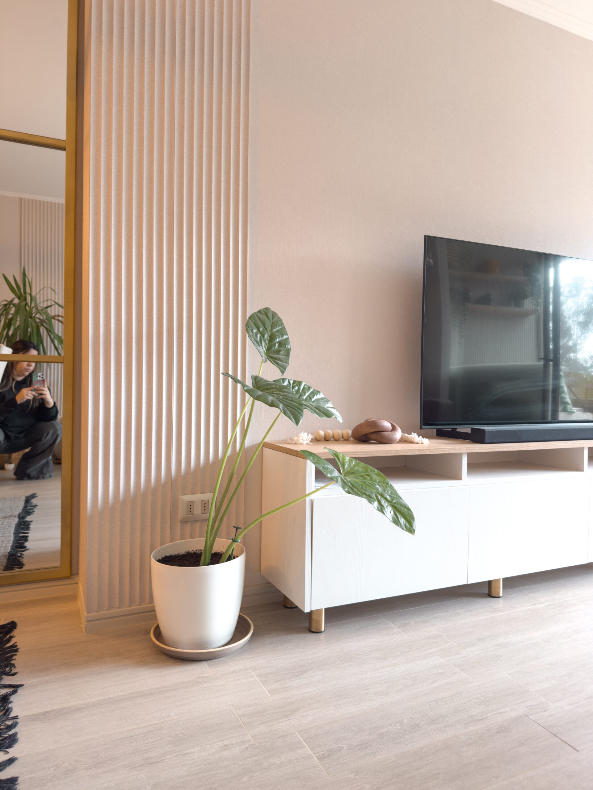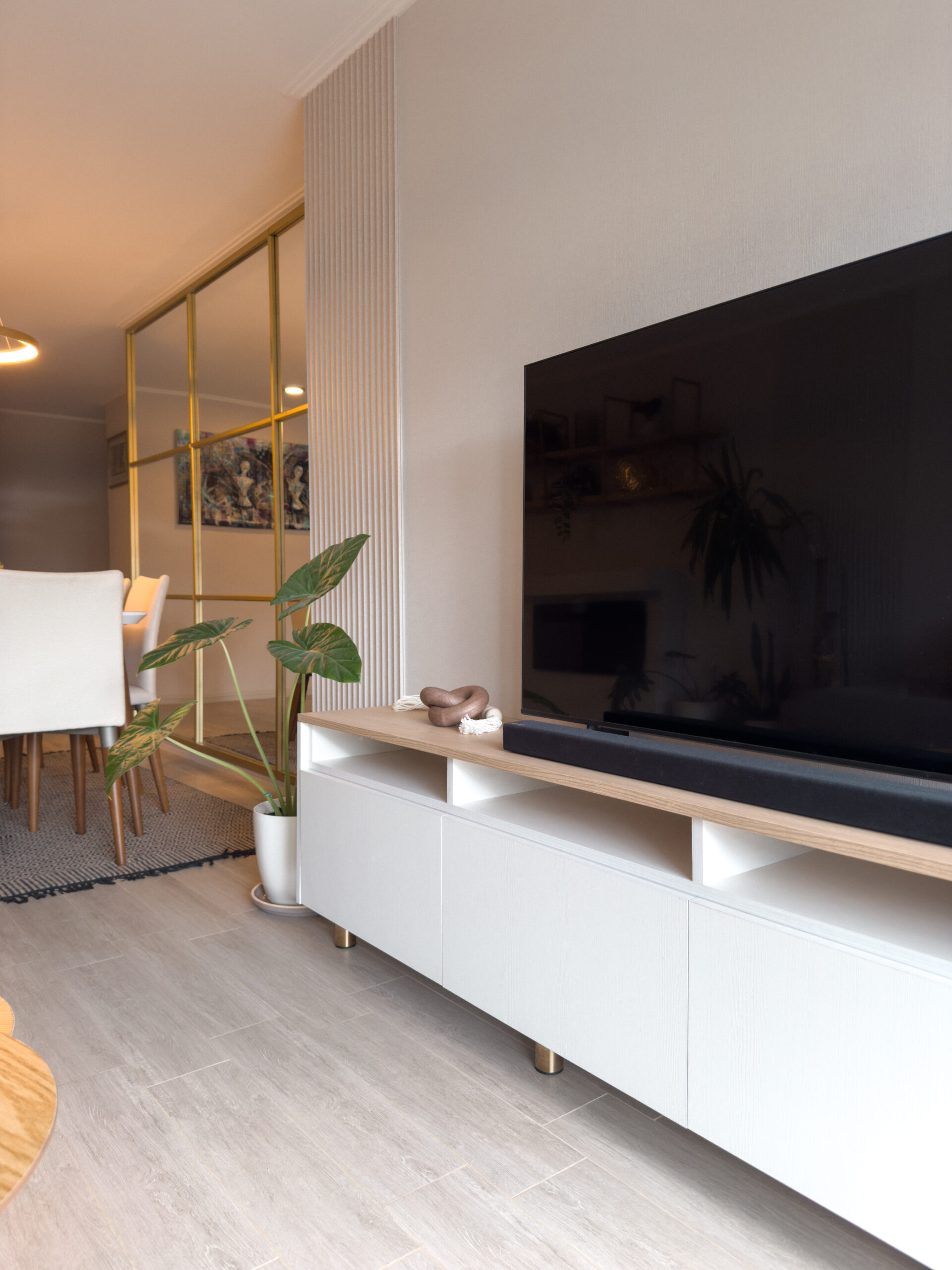 Proyecto de interiorismo en recibidor, living, comedor y terraza, donde una paleta de tonos nude, mobiliario a medida y grandes espejos permiten ampliar visualmente los espacios. La chimenea empotrada y los revestimientos de muro unifican el conjunto, mientras que los elementos decorativos y el color aportan calidez, logrando un hogar acogedor y equilibrado.